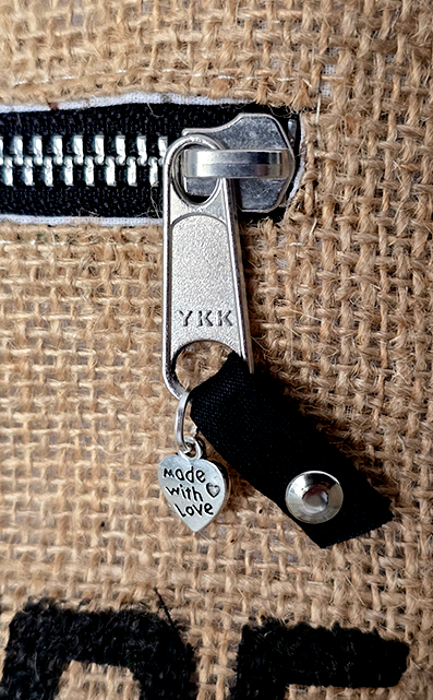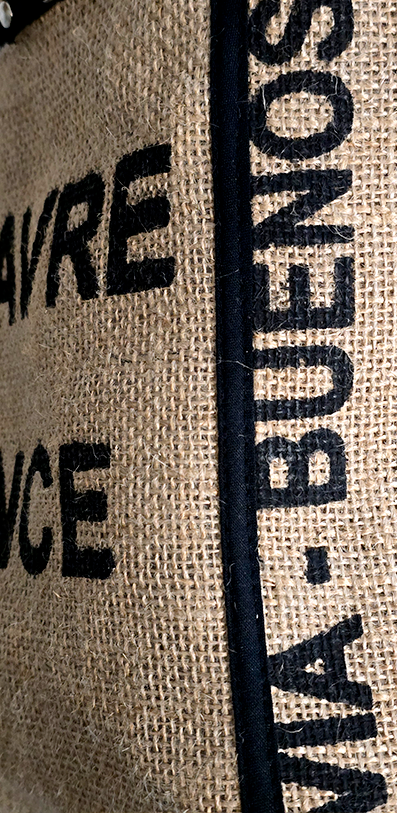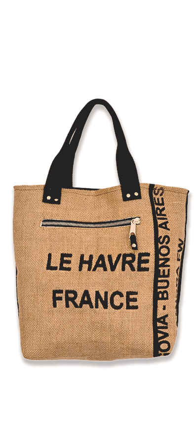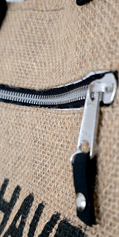 El frente presenta una impresión tipográfica, que evoca el origen portuario de los sacos de café y refuerza su estética industrial y vintage. También incorpora un bolsillo frontal con cierre metálico, ideal para guardar objetos pequeños de forma segura.
