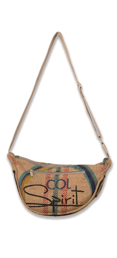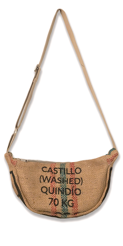Confeccionada en tela de saco de café, reutilizada y tratada para garantizar resistencia y durabilidad.