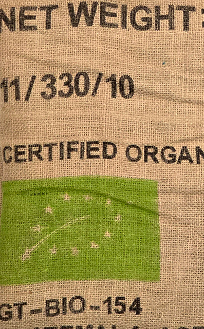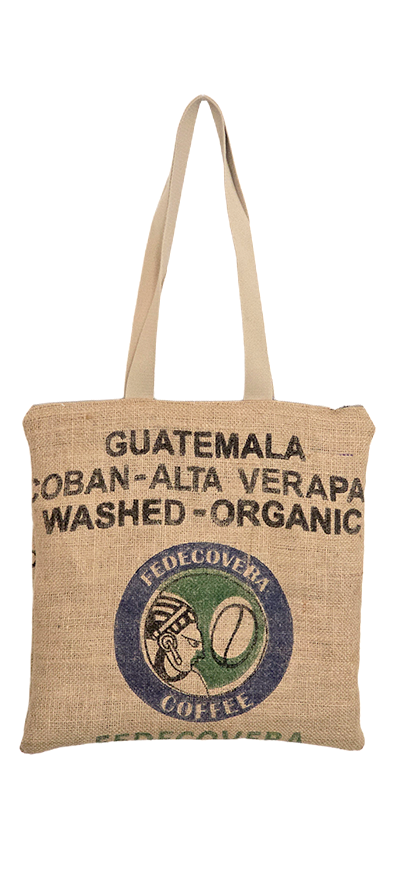 El frente conserva las inscripciones originales del saco, con referencias al origen del café —Guatemala, Cobán Alta Verapaz— y sellos distintivos que aportan identidad y autenticidad a la pieza. El dorso presenta información técnica del lote, manteniendo una estética sobria y coherente con el diseño original del material.