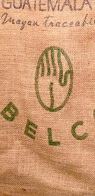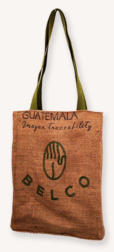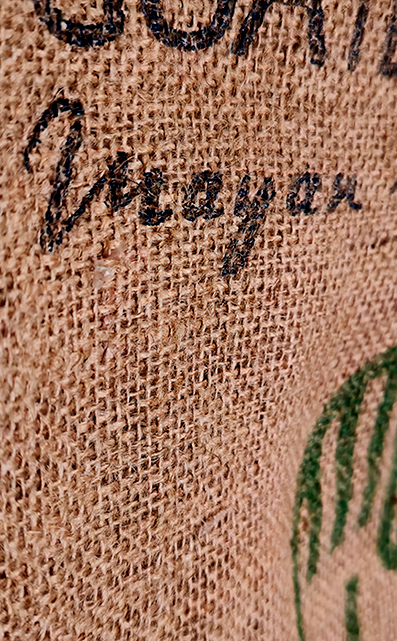 El frente conserva las inscripciones originales del saco, con referencias al origen del café de Guatemala y elementos gráficos distintivos que aportan identidad y carácter. El dorso presenta datos de trazabilidad y procedencia, manteniendo una estética sobria y fiel al material original.