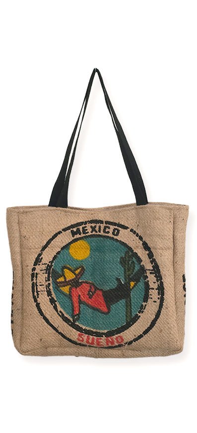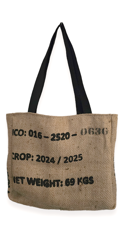 Confeccionado en tela de saco de café reciclado de yute natural, con textura rústica y acabado ecológico.