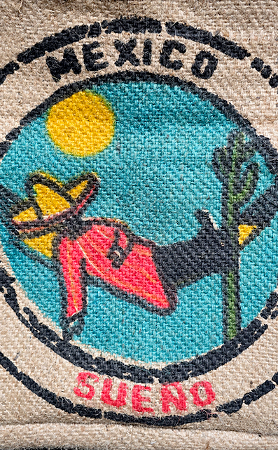 El frente presenta una impresión circular en colores vivos que muestra una ilustración estilizada de un hombre descansando en una hamaca bajo un cactus, evocando un ambiente relajado y cultural.