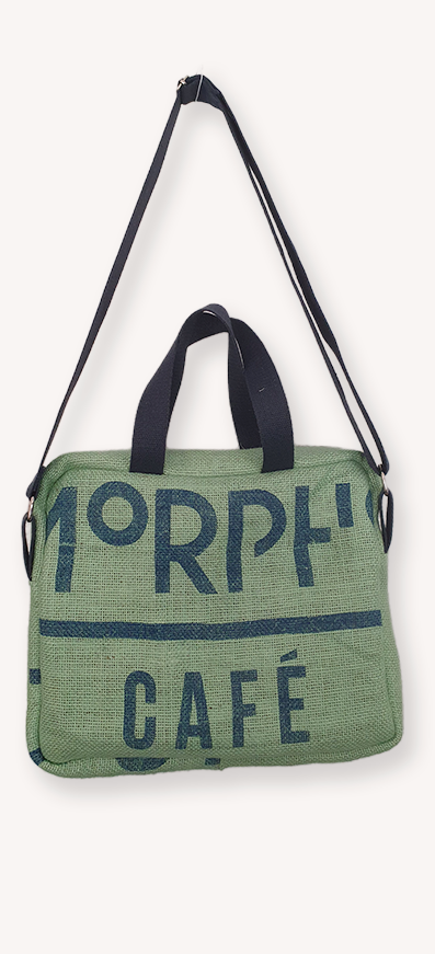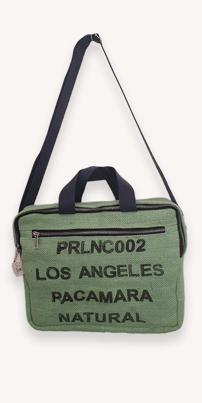 Estilo maletín artesanal, fabricado con tela de saco de café reciclado de yute en tono verde oliva, con una textura rústica y apariencia sostenible.