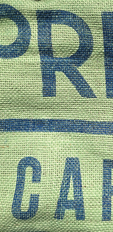 El dorso mantiene las marcas del saco original, que identifican el tipo de café y su procedencia.