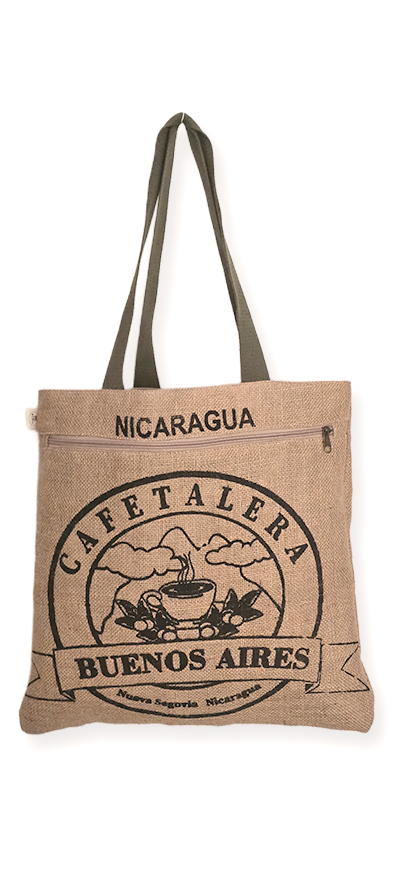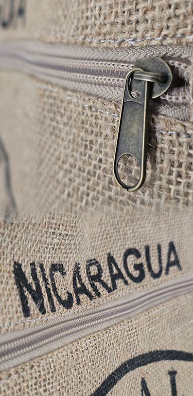 El frente presenta las inscripciones originales del saco, con referencia al origen del café de Nicaragua y el emblema de la cafetalera, incorporando además un bolsillo exterior con cierre, que aporta funcionalidad sin perder la estética artesanal. El dorso mantiene la información técnica del lote, reforzando el carácter auténtico y original del material.